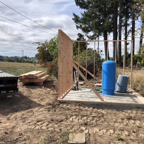 First came gently relocating the pressure tank to the side of the slab. Fortunately it was plumbed with flexible PEX pipe so I was able to move it. Then I had to demo the old slab, form up the new slab and pour concrete. Once concrete was poured I had to place the pressure tank back on the new slab and then build the pump house around it.