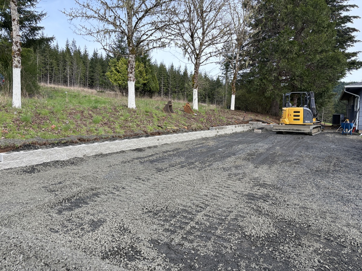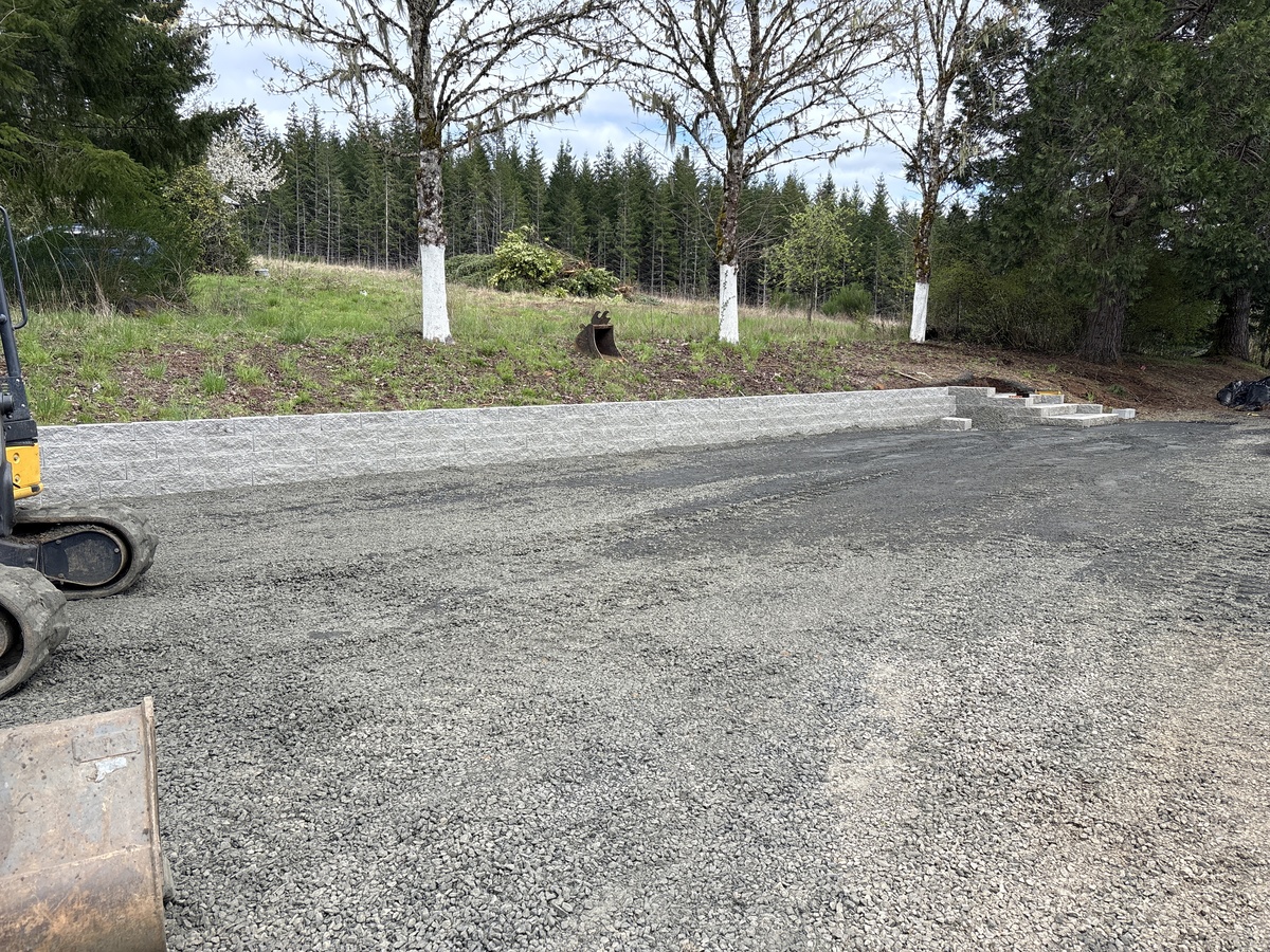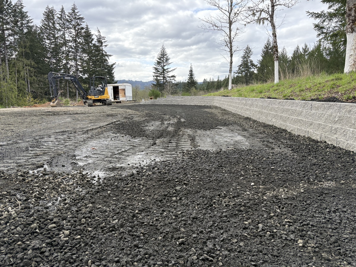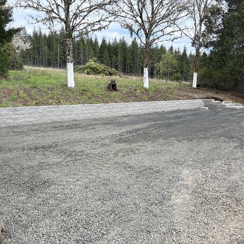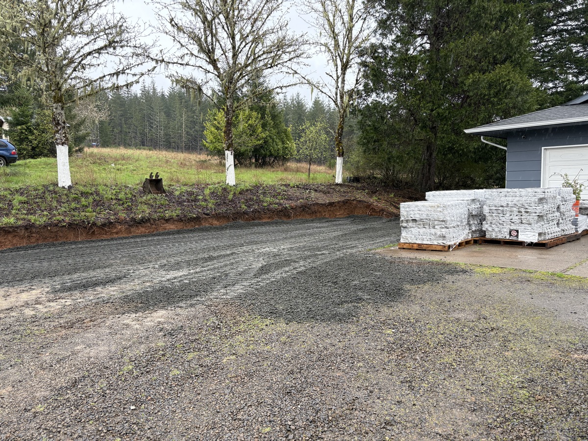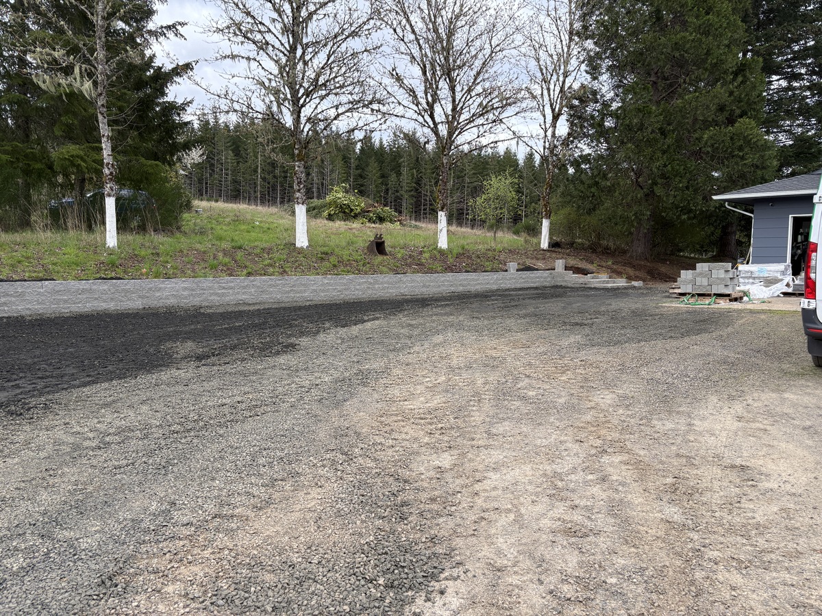 For this project, the homeowner wanted to reclaim some usable parking space and eliminate the soggy muddy mess at the bottom of the slope. So we started with a clean cut to bring the grade to a good sub grade below the driveway elevation. Applied a road base fabric to keep the mud from pushing up through the rock. Then we added a base layer of rock as well as a retaining wall to make the edge of the hillside look clean and keep from eroding. I also added a stairway to match the retaining wall blocks used for a smooth access to the upper level of the yard. On the side of the driveway we extended the road up a short way to create a turn around and also add more parking area.