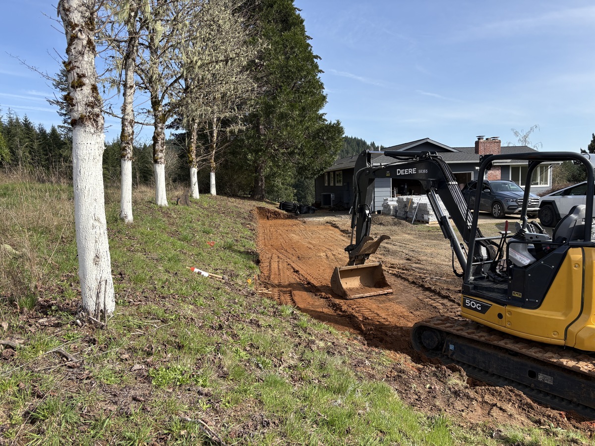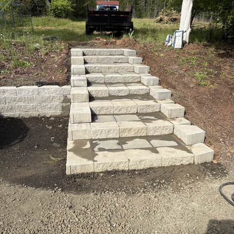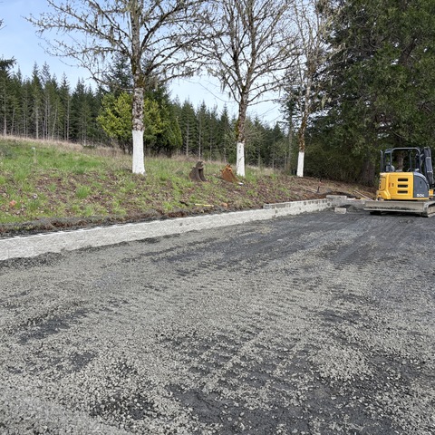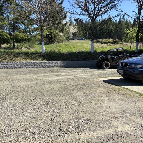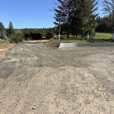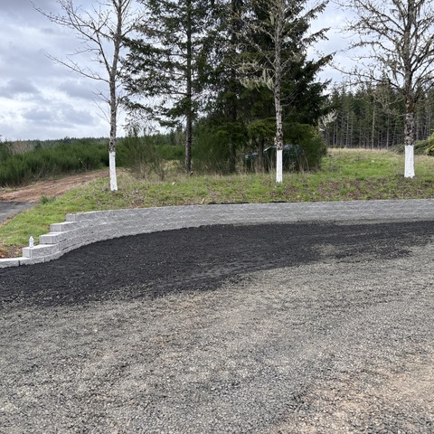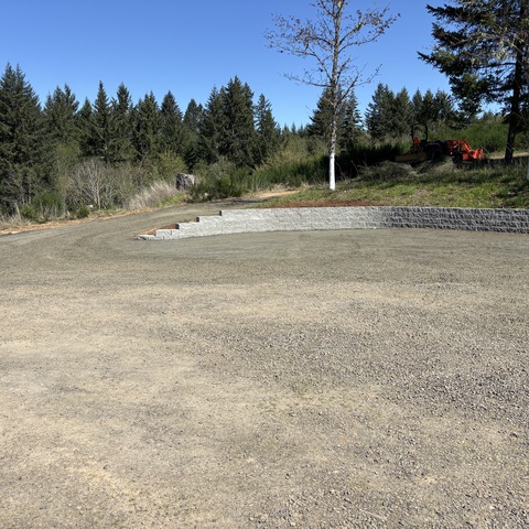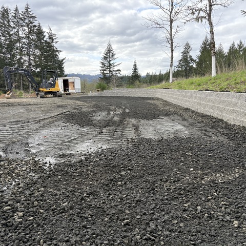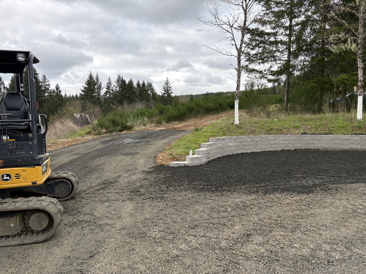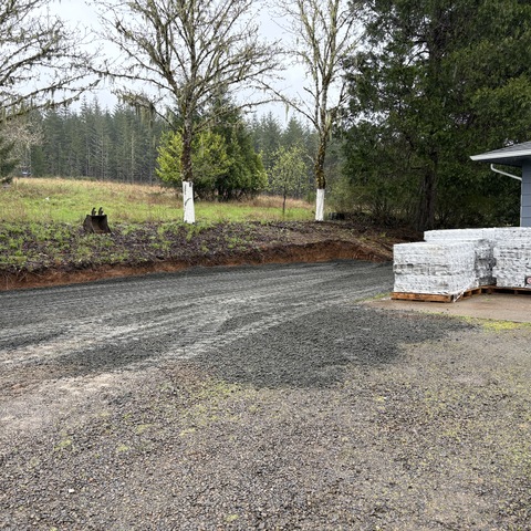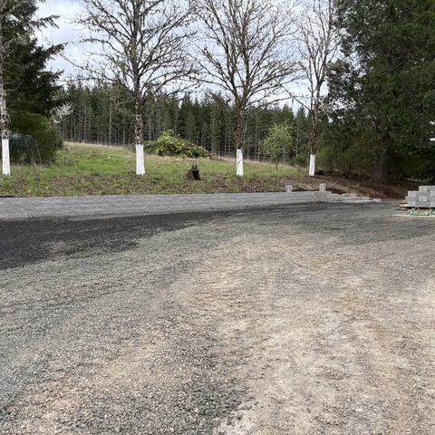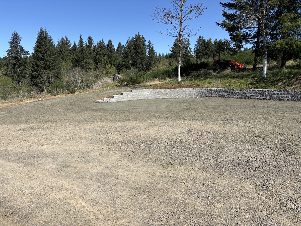 For this project, the homeowner wanted to reclaim some usable parking space and eliminate the soggy muddy mess at the bottom of the slope. So we started with a clean cut to bring the grade to a good sub grade below the driveway elevation. Applied a road base fabric to keep the mud from pushing up through the rock. Then we added a base layer of rock as well as a retaining wall to make the edge of the hillside look clean and keep from eroding. I also added a stairway to match the retaining wall blocks used for a smooth access to the upper level of the yard. On the side of the driveway we extended the road up a short way to create a turn around and also add more parking area.