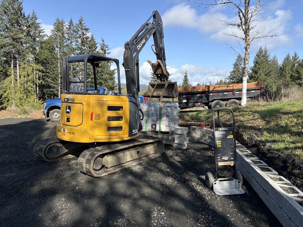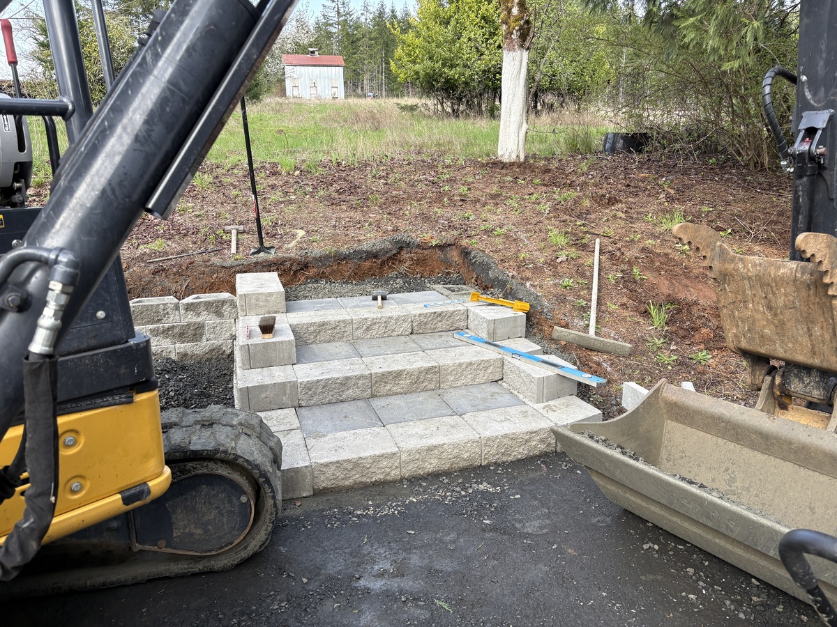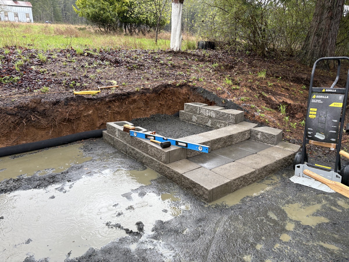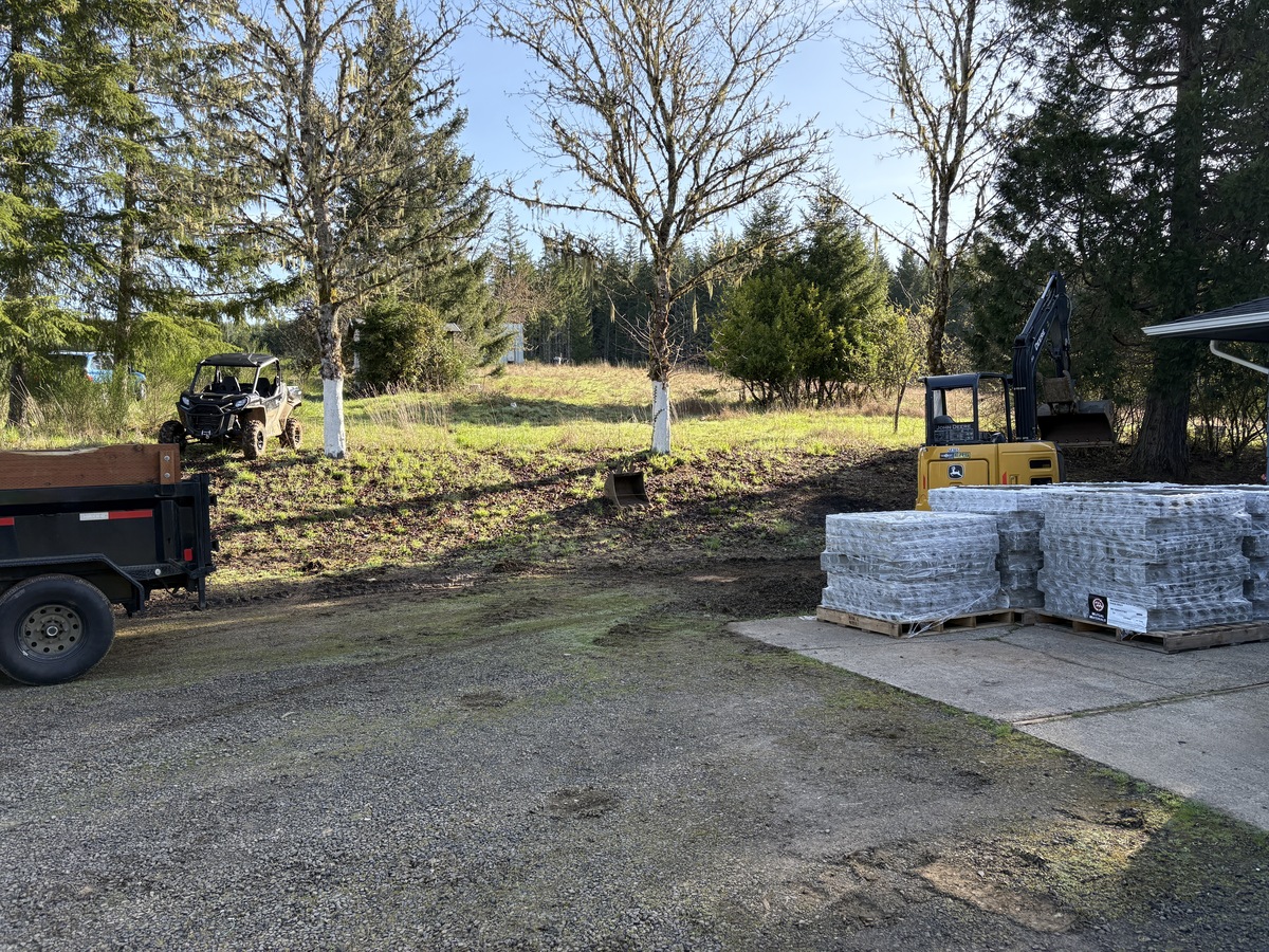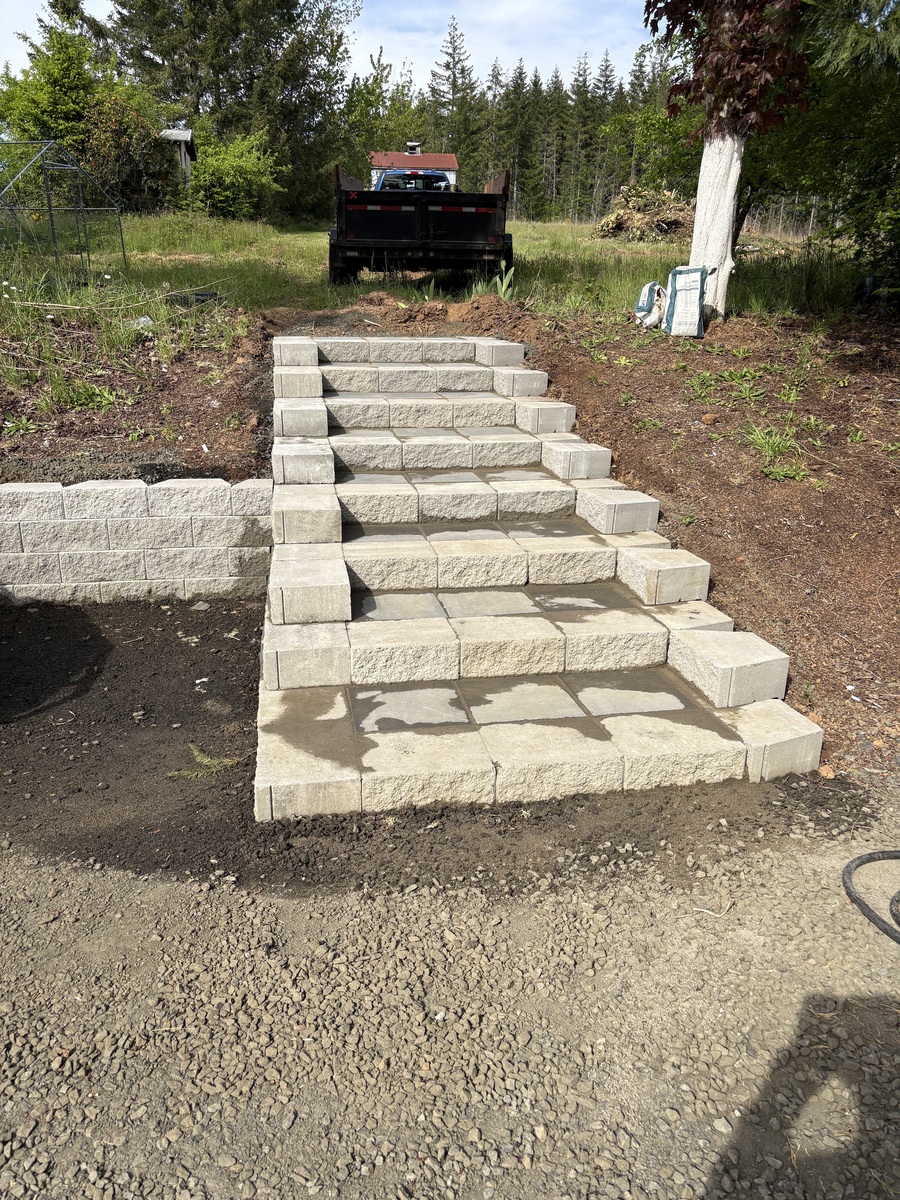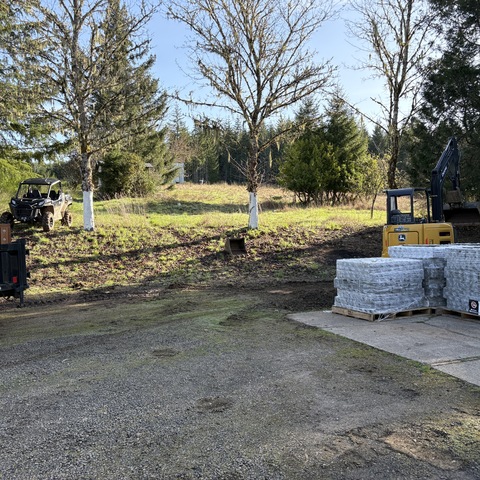 For this project, the homeowner wanted to reclaim some usable parking space and eliminate the soggy muddy mess at the bottom of the slope. So we started with a clean cut to bring the grade to a good sub grade below the driveway elevation. Applied a road base fabric to keep the mud from pushing up through the rock. Then we added a base layer of rock as well as a retaining wall to make the edge of the hillside look clean and keep from eroding. I also added a stairway to match the retaining wall blocks used for a smooth access to the upper level of the yard. On the side of the driveway we extended the road up a short way to create a turn around and also add more parking area.