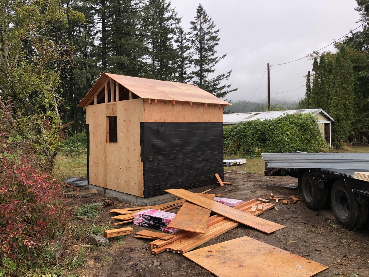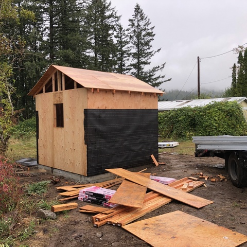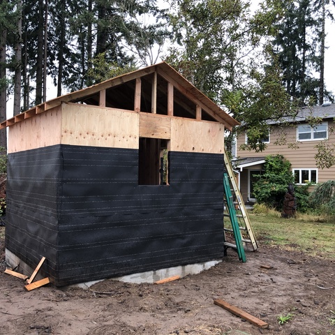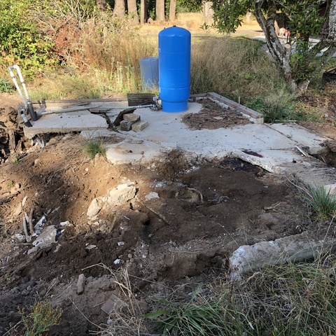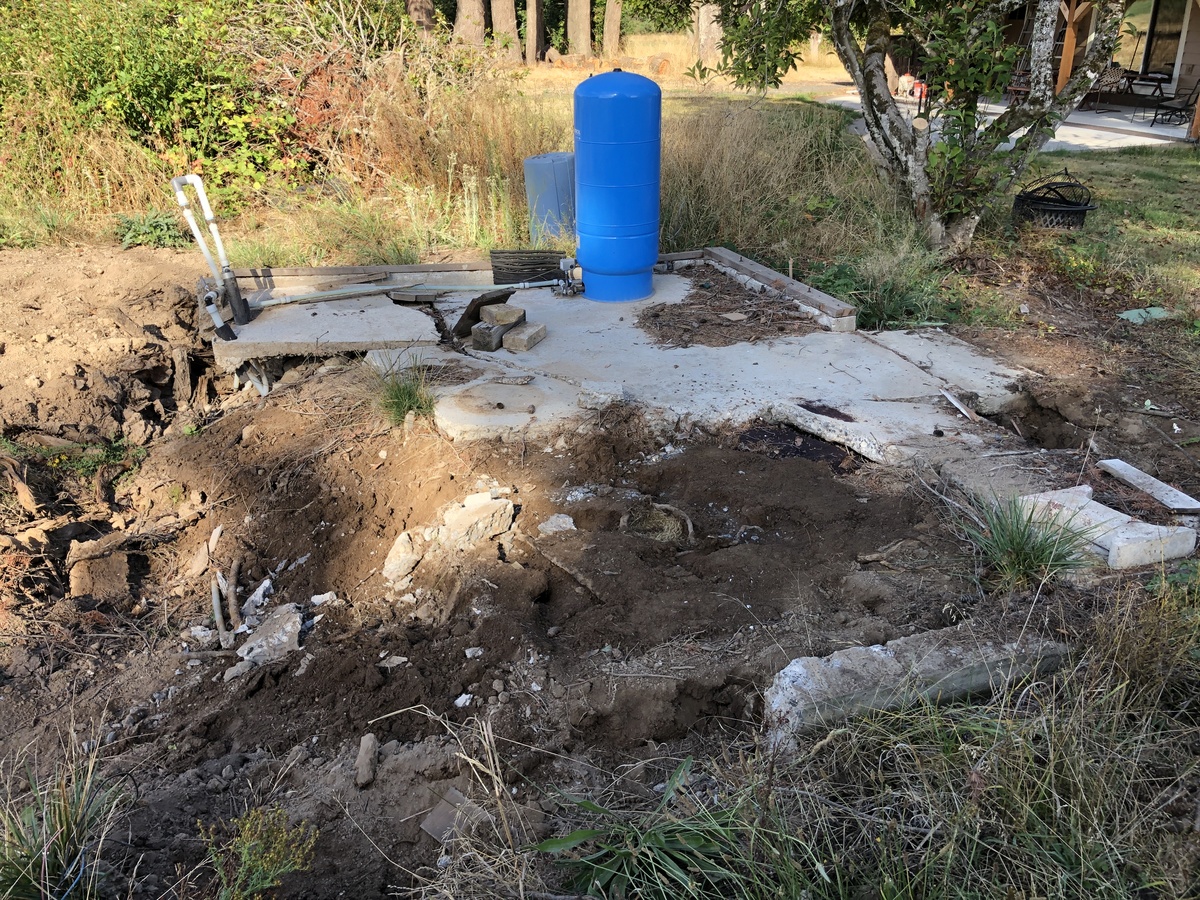First came gently relocating the pressure tank to the side of the slab. Fortunately it was plumbed with flexible PEX pipe so I was able to move it. Then I had to demo the old slab, form up the new slab and pour concrete. Once concrete was poured I had to place the pressure tank back on the new slab and then build the pump house around it.