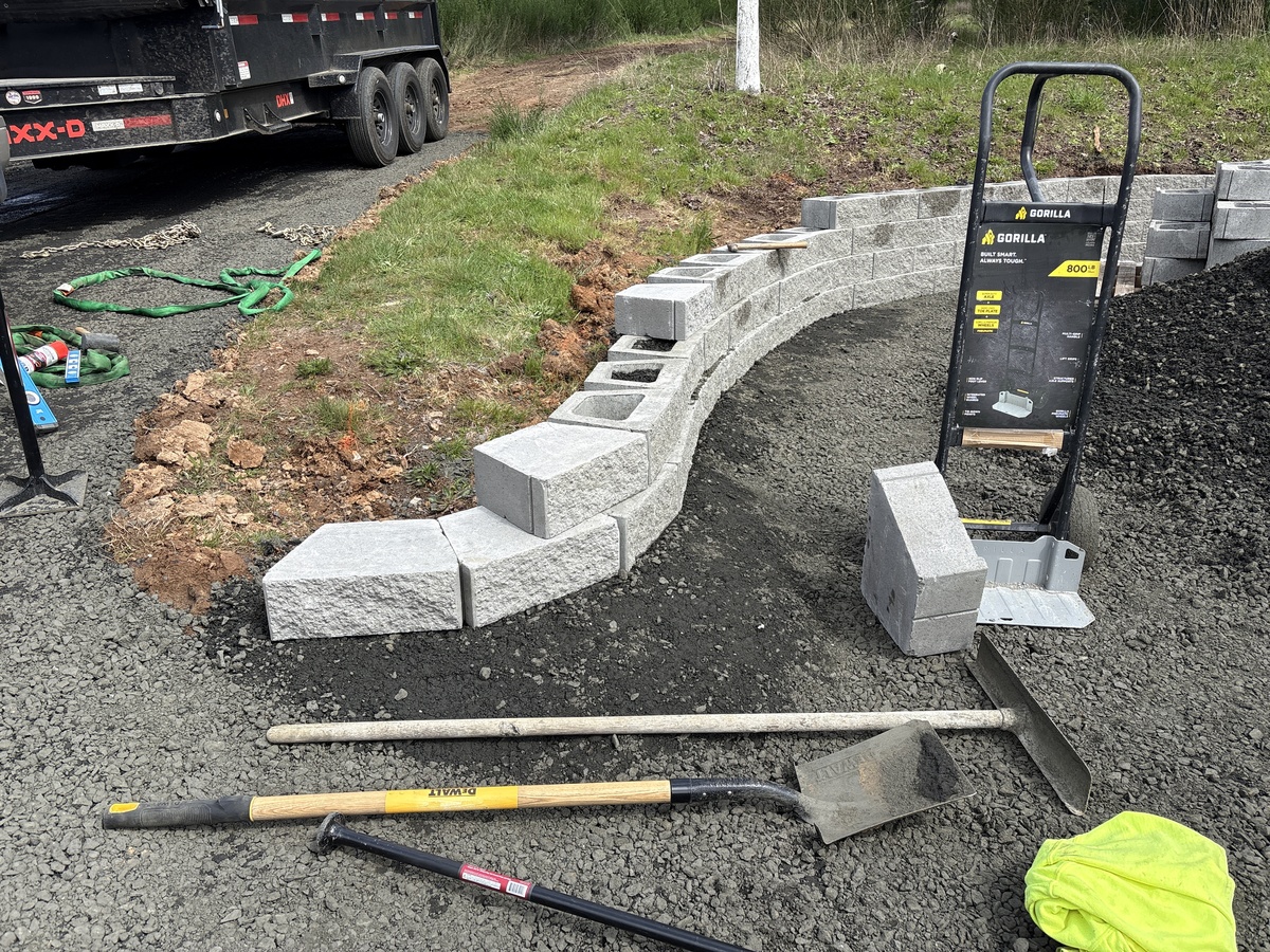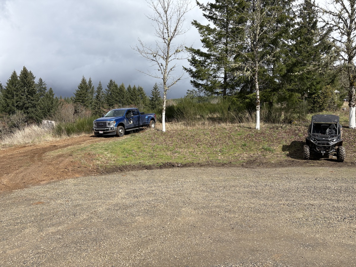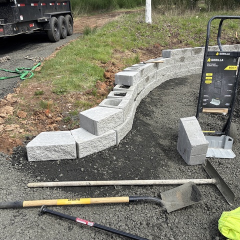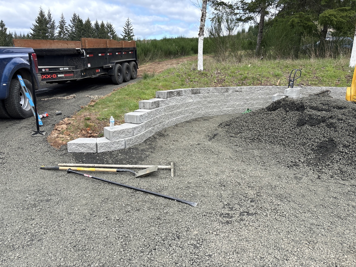 For this project, the homeowner wanted to reclaim some usable parking space and eliminate the soggy muddy mess at the bottom of the slope. So we started with a clean cut to bring the grade to a good sub grade below the driveway elevation. Applied a road base fabric to keep the mud from pushing up through the rock. Then we added a base layer of rock as well as a retaining wall to make the edge of the hillside look clean and keep from eroding. I also added a stairway to match the retaining wall blocks used for a smooth access to the upper level of the yard. On the side of the driveway we extended the road up a short way to create a turn around and also add more parking area.
