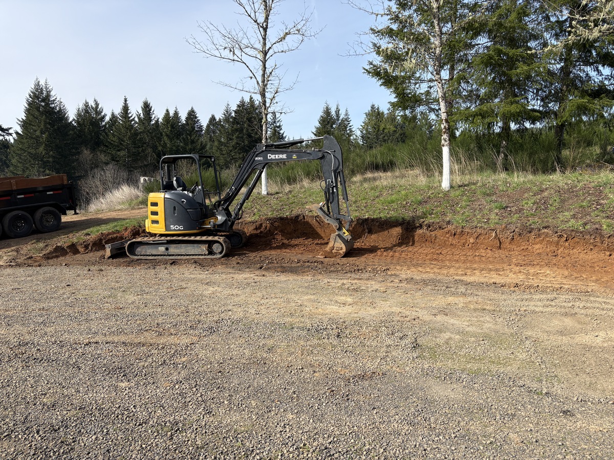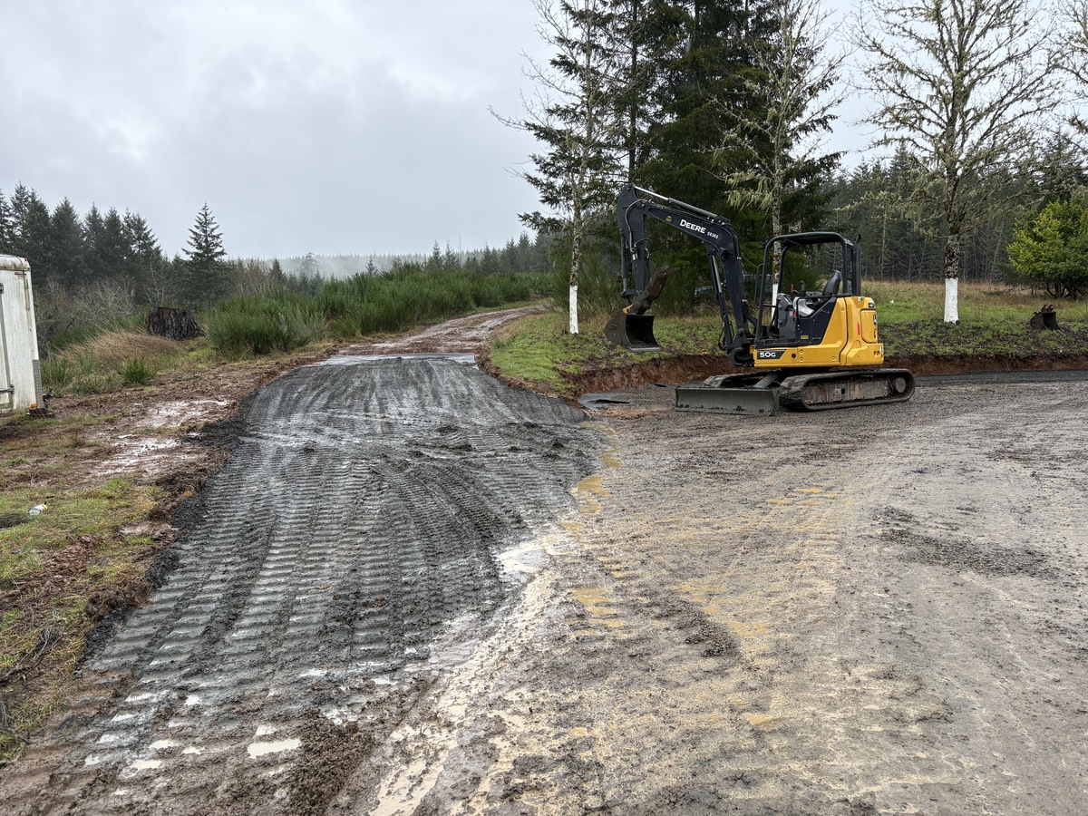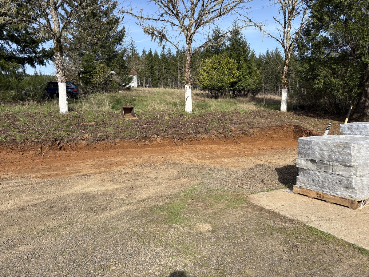 For this project, the homeowner wanted to reclaim some usable parking space and eliminate the soggy muddy mess at the bottom of the slope. So we started with a clean cut to bring the grade to a good sub grade below the driveway elevation. Applied a road base fabric to keep the mud from pushing up through the rock. Then we added a base layer of rock as well as a retaining wall to make the edge of the hillside look clean and keep from eroding. I also added a stairway to match the retaining wall blocks used for a smooth access to the upper level of the yard. On the side of the driveway we extended the road up a short way to create a turn around and also add more parking area.